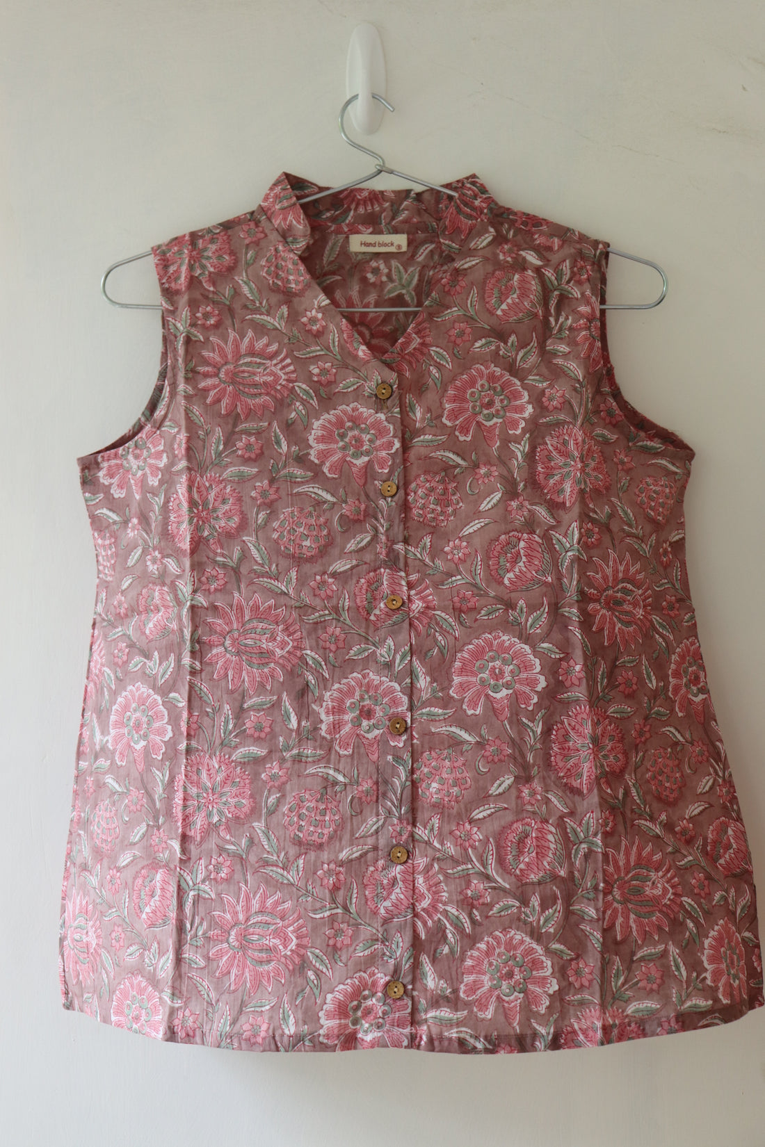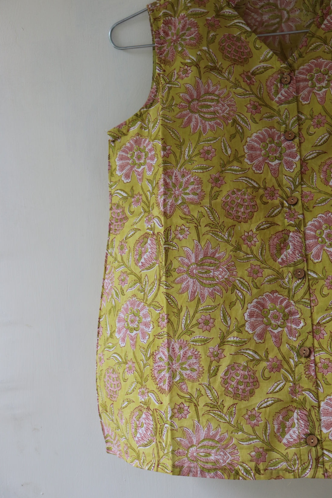 This cotton top, made using hand block printing techniques, features a relaxed sleeveless silhouette, v-neckline...