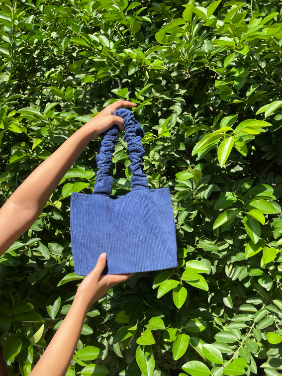 This tote bag in blue corduroy features a relaxed tote shape, a fixed long strap...