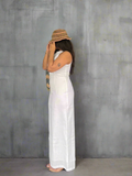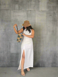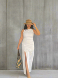 A modest maxi dress featuring a high round neckline and sleeveless design, complete with a zip closure at the back. It is a fitted silhouette with a straight skirt and a front slit for a touch of subtle sexiness. Made from the softest cotton, this dress will transport you to lavender fields, seaside cafés, and endless blue skies. Style it with simple sandals for effortless day-to-night vacation wear. It includes lining and is true to size.