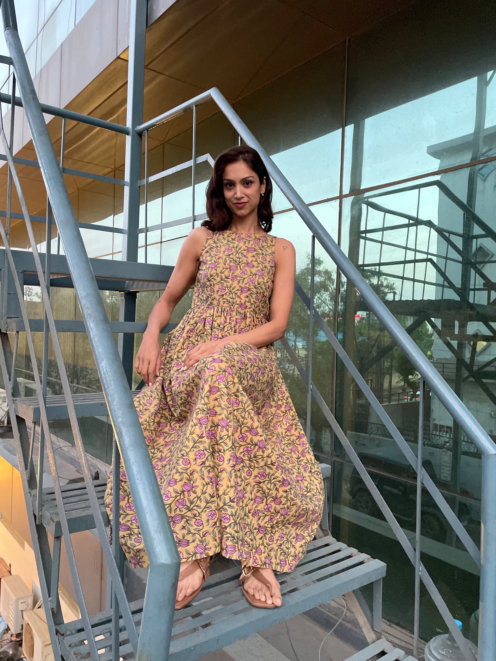 A playful dress with a gathered skirt adds a touch of whimsy to the feminine, sleeveless design featuring a flattering boat neckline and fitted bodice.