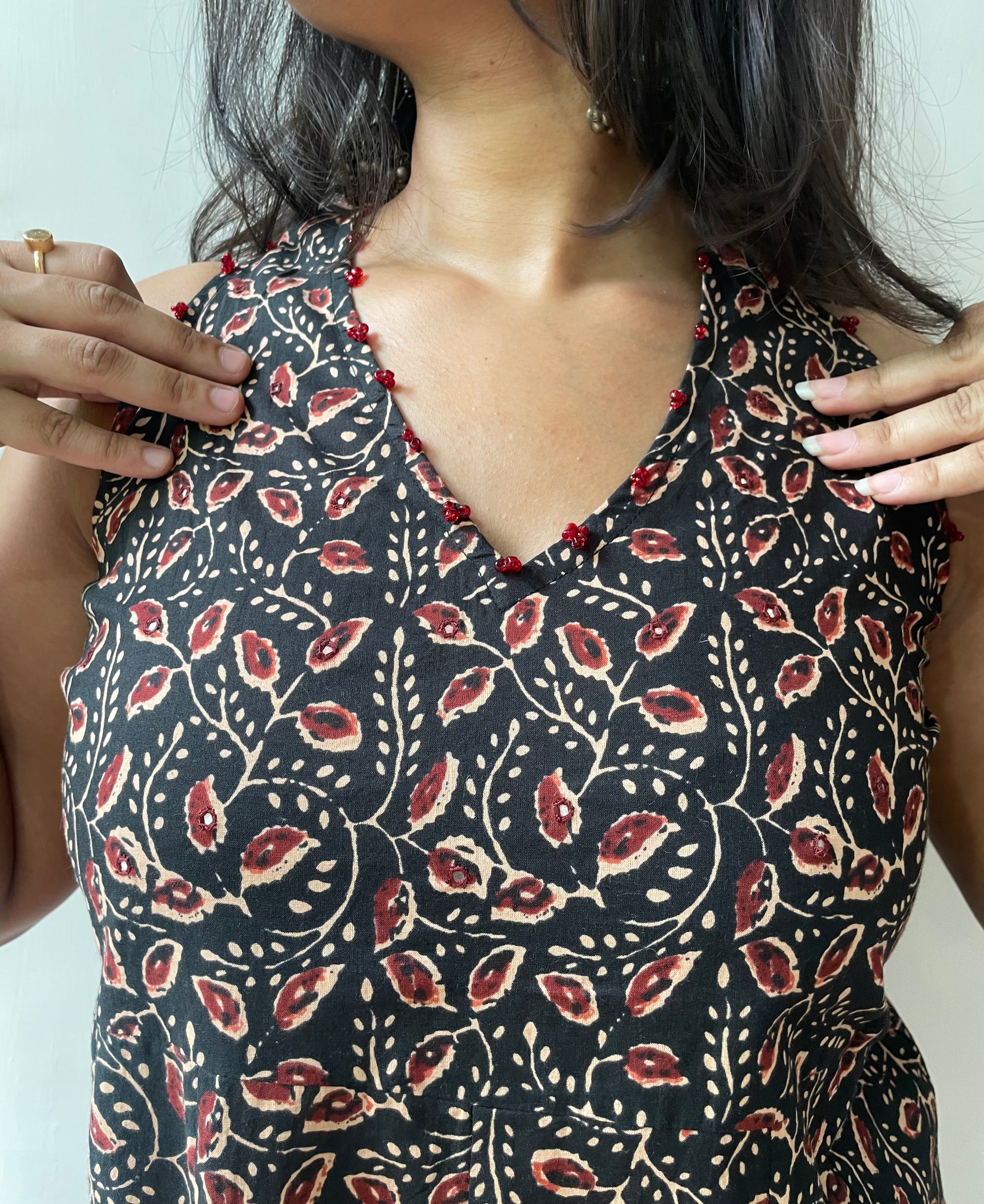 A sleeveless cotton maxi dress with a V-shaped neckline that cinches at the waist. The A-line silhouette skirt consists of panels for more flare. The neckline and armhole consists of beading details as well.
