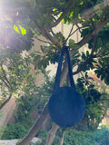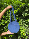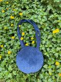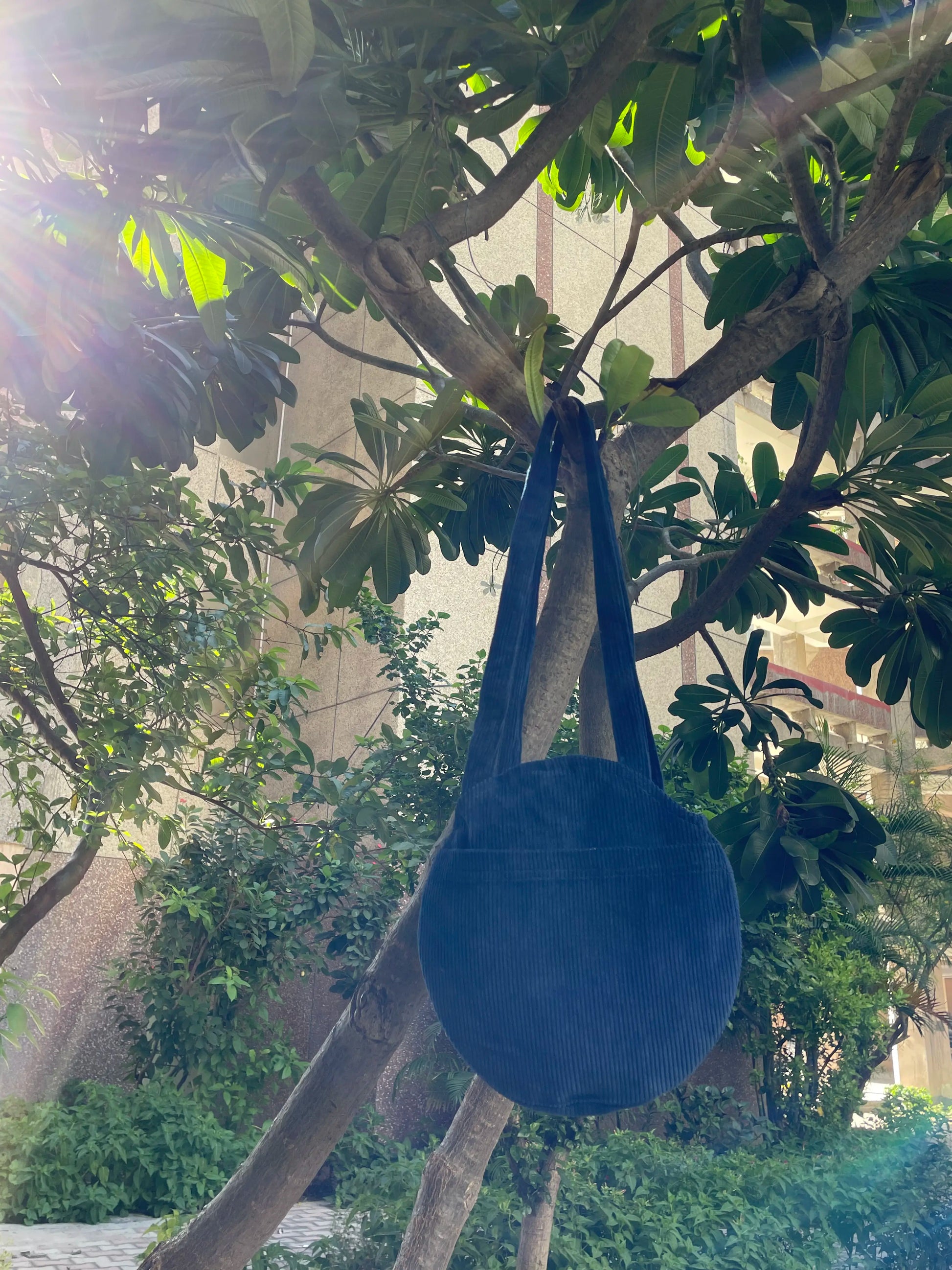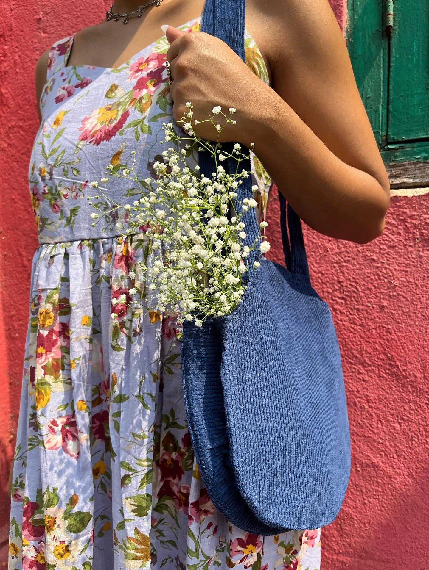 This tote bag in blue corduroy features a relaxed tote shape, a fixed long strap and a simple round pattern. Designed to hold all your summer necessities with ease.